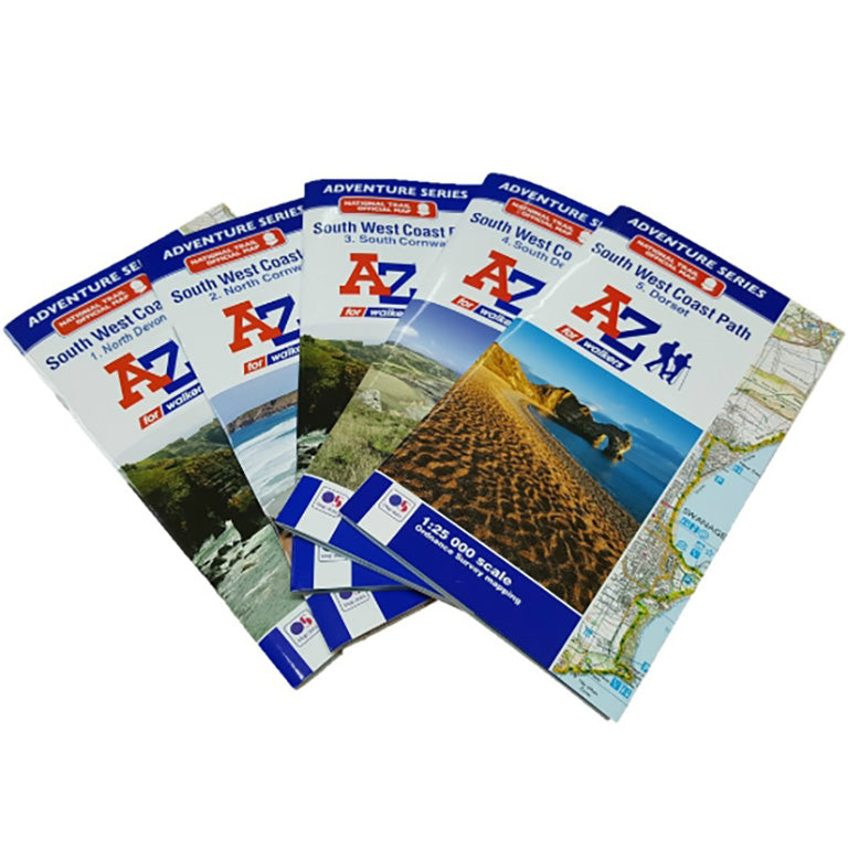 Full set of 5 x A-Z maps covering the whole of the South West Coast Path. Includes an index to towns, villages, natural features, nature reserves, car parks and youth hostels. Each index entry has a page reference and a 6-figure National Grid Reference.