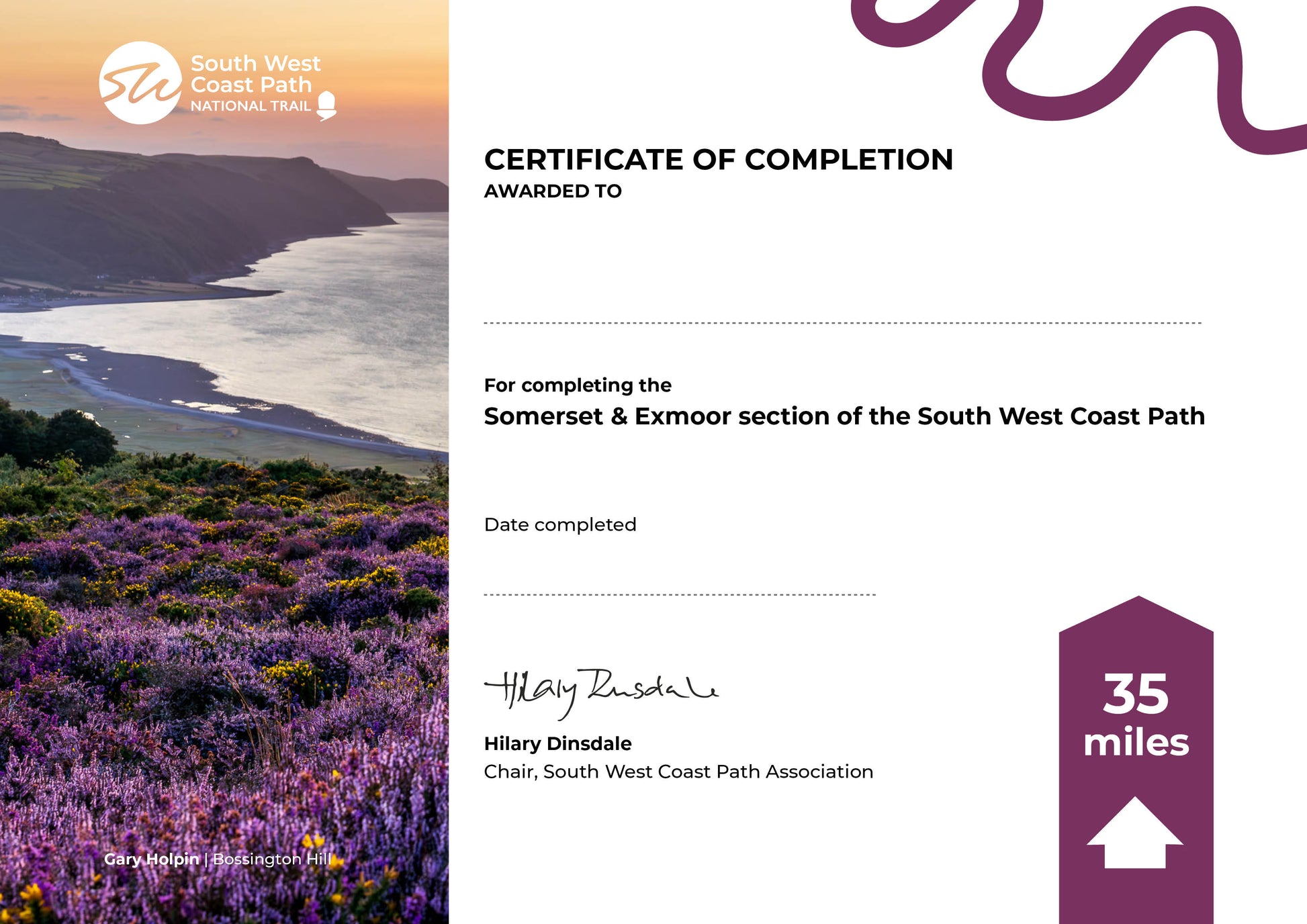 Congratulate yourself for completing the Somerset & Exmoor section of Coast Path with a personalised certificate with your name and detailing the wording: '....has completed The Somerset & Exmoor Section of the South West Coast Path'. (35 miles)